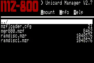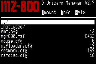 Konfigurační soubor obsahující cestu k MZF, který se má spustit zavaděčem MZFLoader - většinou obsahuje cestu a název souboru s Unicard Managerem. Zavaděč MZFloader je obvykle spouštěn z emulovaného SRAM disku nebo Quick disku. Unicard po resetu nastaví počítači dočasně vlastní SRAM disk s MZFloaderem a ten je natažen a spuštěn. Po zavedení MZFloader prohlédne soubor mzfloader.cfg a spustí program v něm uvedený (obvykle Unicard manager). Pak teprve nastaví RAM (SRAM) disk podle obsahu příslušného konfiguračního souboru. Tato funkcionalita poměrně dobře funguje na MZ-1500, ale na MZ-800 není zcela spolehlivá. Někdy pomůže vstoupit do monitoru klávesou M (nebo M+Reset) a MZFloader ze SRAM disku spustit přes příkaz EB. Pokud nepotřebujete aktivně využívat RAM disk, můžete do něj přímo vložit mzfloader.ram, což funguje lépe, ale je potřeba si dát pozor na přepsání RAM disku například při spuštění BASICu nebo CP/M. Pokud nepotřebujete aktivně využívat Quick disk, je ideální startovat MZFloader z něj - do zařízení QD: vložte mzfloader.mzq. Spouštění zavaděče MZFloader z QD: je spolehlivé na všech platformách. Pokud potřebujete jen spouště MZF programy a hry, je to prozatím doporučované řešení. Současně, pokud máte vloženou disketu v některé z virtuálních floppy, použijte Q+Reset pro přímé načtení QD místo spuštění FD, které má jinak vyšší prioritu.